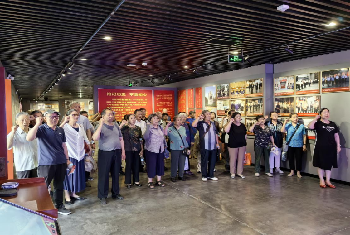 在四五党性教育基地,老党员们怀着无比崇敬的心情依次参观了“星星之火燎原齐鲁”“廿二烈士血洒刑场”“坚守信仰矢志不渝”“牢记使命砥砺前行”等展厅,通过文字讲解、影像呈现、实物展陈等形式,身临其境地学习了山东早期党组织发展与斗争的过程,深入了解了“四五”烈士英勇就义的事迹。对中国共产党人的初心和使命有了更加深刻的体悟和认识。面对党旗,全体党员同举右手,重温入党誓词,追忆入党初心,表达了对党的坚定信念和真挚情感。