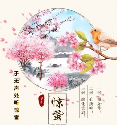 “阳气初惊蛰,韶光大地周。桃花开蜀锦,鹰老化春鸠。”出自唐代元稹的《惊蛰二月节》,意思是冬至之后,阳气上升,刚到惊蛰,韶光显现,弥漫大地。春风徐来,桃花盛开,黄鹂歌唱,鹰早已不见,只闻得鸠在欢快的鸣叫。