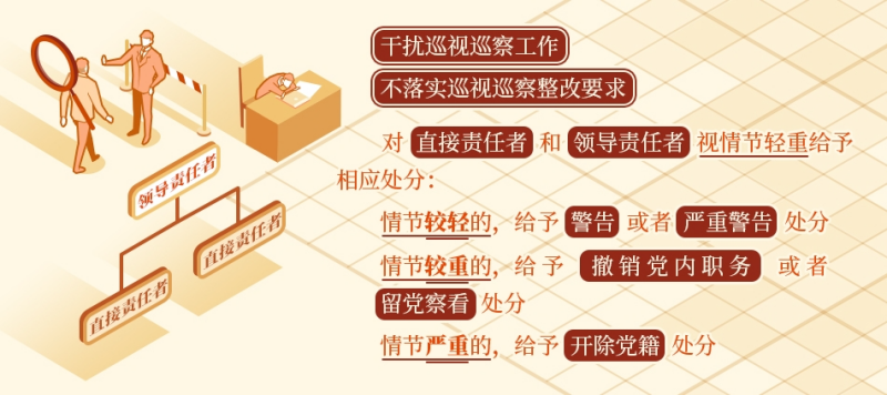 《中国共产党纪律处分条例》规定,干扰巡视巡察工作或者不落实巡视巡察整改要求,属于违反政治纪律的行为,对直接责任者和领导责任者,视情节轻重给予相应处分。情节较轻的,给予警告或者严重警告处分;情节较重的,给予撤销党内职务或者留党察看处分;情节严重的,给予开除党籍处分。