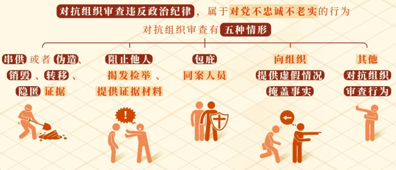 《中国共产党纪律处分条例》第六十三条规定了对抗组织审查,应予处分的五种情形:串供或者伪造、销毁、转移、隐匿证据;阻止他人揭发检举、提供证据材料;包庇同案人员;向组织提供虚假情况,掩盖事实;其他对抗组织审查行为。