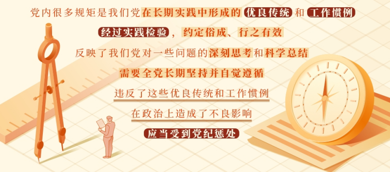 党内很多规矩是我们党在长期实践中形成的优良传统和工作惯例,经过实践检验,约定俗成、行之有效,反映了我们党对一些问题的深刻思考和科学总结,需要全党长期坚持并自觉遵循。这些规矩看着没有白纸黑字的规定,但都是一种传统、一种范式、一种要求。违反了这些优良传统和工作惯例,在政治上造成了不良影响,应当受到党纪惩处。