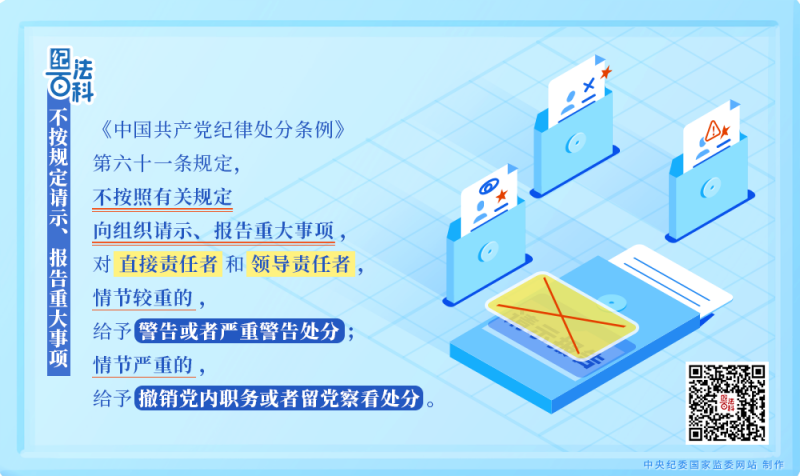 《中国共产党纪律处分条例》第六十一条规定,不按照有关规定向组织请示、报告重大事项,对直接责任者和领导责任者,情节较重的,给予警告或者严重警告处分;情节严重的,给予撤销党内职务或者留党察看处分。