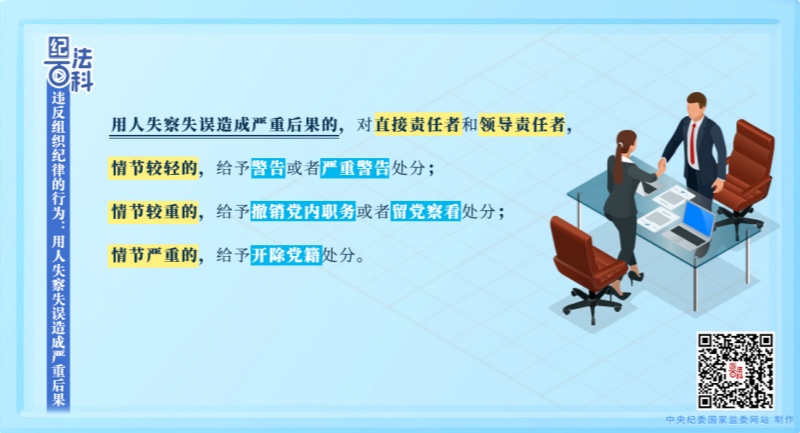 《条例》第八十四条、第八十五条对违规选任干部行为列出负面清单,作出处分规定。第八十四条第二款规定,用人失察失误造成严重后果的,依照第一款规定处理。《关于新形势下党内政治生活的若干准则》规定,加强选人用人监督问责,对用人失察失误的严肃追究责任。