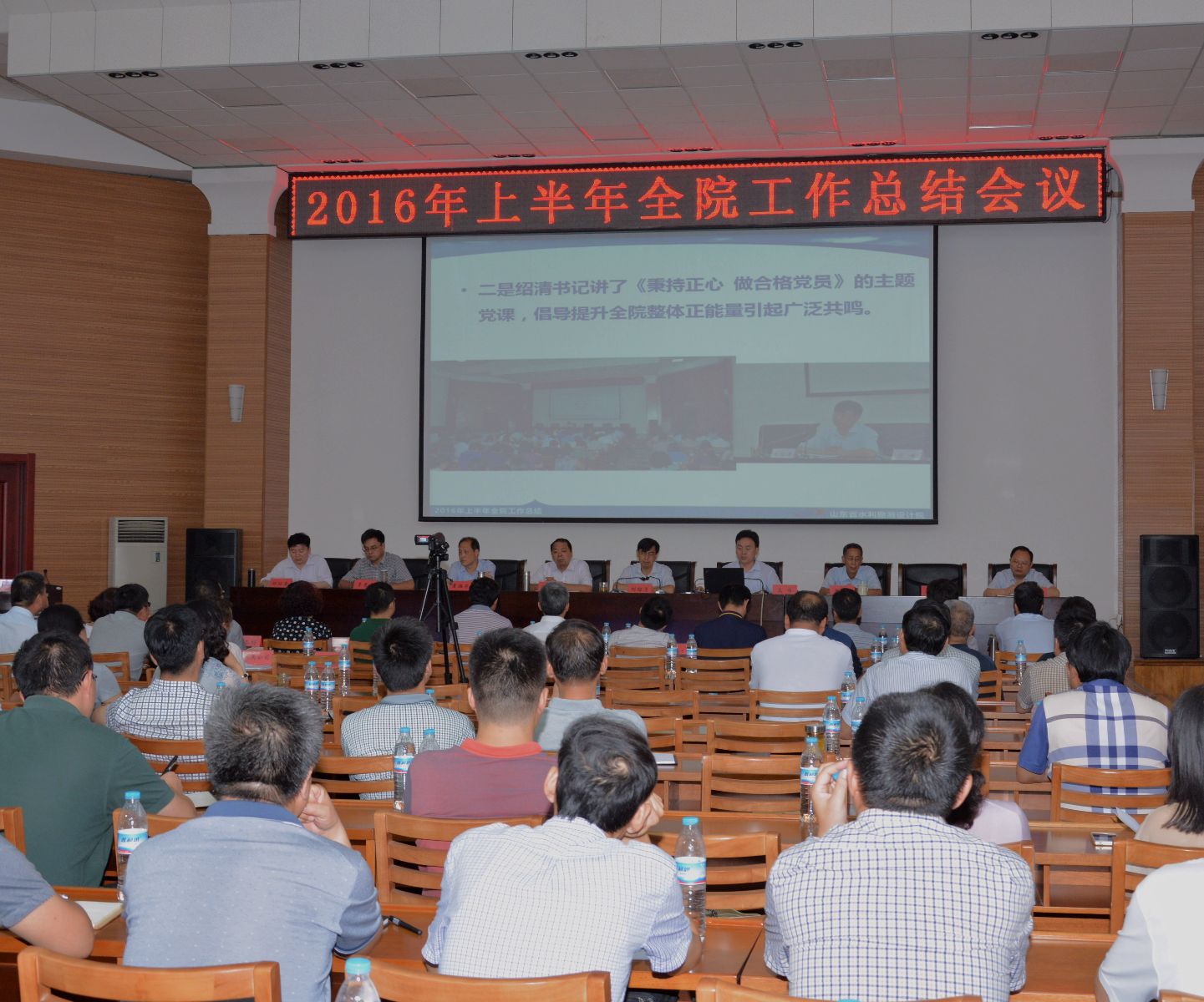 会上,各部门、单位汇报了上半年各自工作情况和下半年工作打算。高峰院长代表院党委作了题为《改革创新  继续前进》的工作报告,总结了年度工作目标进展情况、上半年我院的十件大事和主要工作成绩,剖析了我院内外部出现的各种新变化,指出要从六个方面入手继续改进各项工作,围绕“改革、创新、发展”部署了下半年的重点工作,最后对我院面临的体制改革谈了几点意见。
