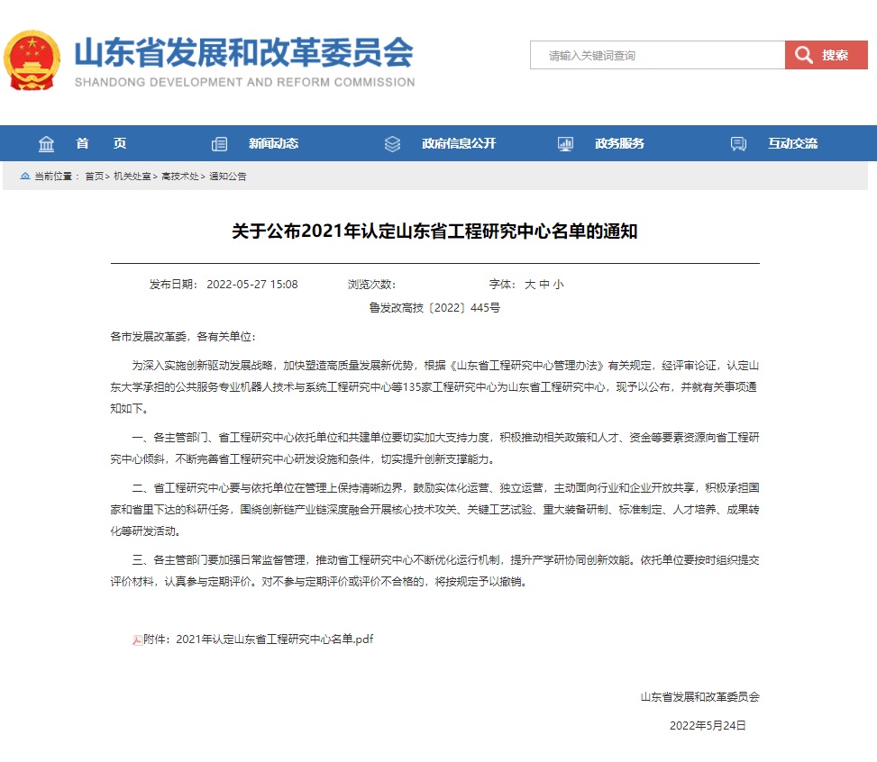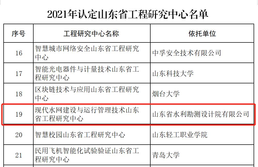 近日,山东省发展和改革委员会发布《2021年认定山东省工程研究中心名单》的通知。经过各市发展改革委、省有关单位等初审和推荐、专家组综合评价和信息审核等程序,2024幸运168飞行艇开奖历史记录(以下简称“山东水设”)牵头,联合浪潮软件科技有限公司、浪潮通信技术有限公司组建的“现代水网建设与运行管理技术山东省工程研究中心”(以下简称工程研究中心)获批,正式列入山东省省级工程研究中心之一。
