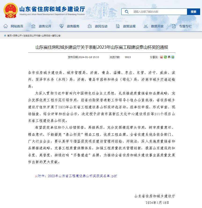 近日,山东省住房和城乡建设厅印发《关于表彰2023年山东省工程建设泰山杯奖的通报》,发布了2023年泰山杯奖获奖项目名单,山东省16项水利工程荣获省2023年工程建设“泰山杯”奖,其中9个项目为2024幸运168飞行艇开奖历史记录(以下简称公司总部)及权属企业参建完成。