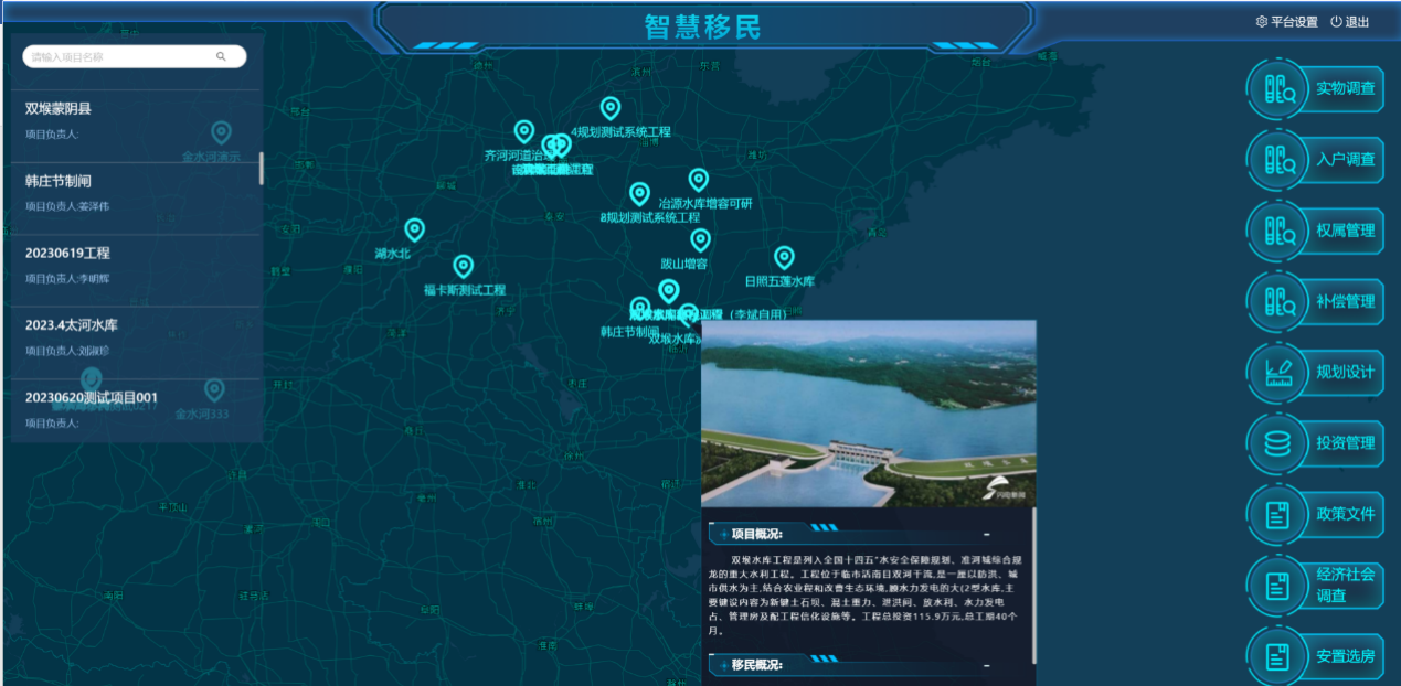 移民设计院研发应用“智慧移民信息大数据综合管控平台系统”,在双堠水库、长会口水库等项目实物指标调查、规划设计、建档管理方面发挥了显著成效,有力推动“传统移民”向“数智移民”大步转型迈进。经实践应用,移民信息采集时间缩减50%,各环节优化节省人次40%,数据准确度提升30%,整体工作效率提升40%。统筹移民基础数据采集、移民安置规划、移民动态管理核心需求,推动移民工作流程控制标准化、业务场景智慧化、多方参与协同化、信息资源数据化,有效解决移民作业数据不充分、标准不一、管理不规范、共享协同难、数据复用挖掘不足等难点。“智慧移民信息大数据综合管控平台系统”中“移民一张图”功能集成接入了区域历史与实时、现状与规划、行业与社会等多元数据,使移民信息更为全面、立体、准确,更加有理有据、可视可感,实现数据横向联动、纵向贯通。目前,二期开发工作已启动实施,将服务于移民安置全周期工作,助力引领山东水设移民设计转型。