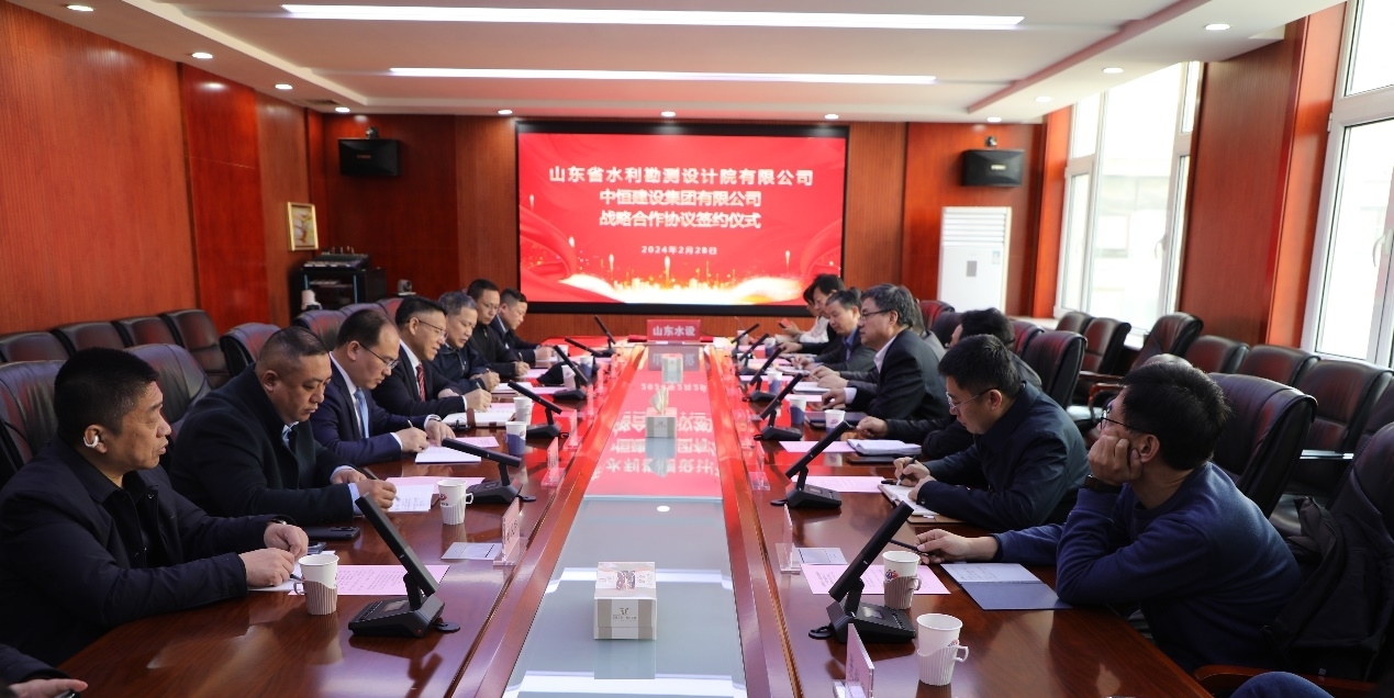 2月28日,2024幸运168飞行艇开奖历史记录(以下简称山东水设)与中恒建设集团有限公司(以下简称中恒建设)在济南签署战略合作协议。山东水设党委副书记、董事、总经理李贵清(主持公司全面工作),山东省工程设计大师、山东省水利水电勘测设计协会荣誉理事长刘长余,山东水设党委委员、副总经理、安全总监曹先玉,山东水设党委委员、副总经理刘帅,中恒控股集团董事长聂吉利,中恒控股集团副总裁、研究总院执行院长郑建平等出席签约仪式。