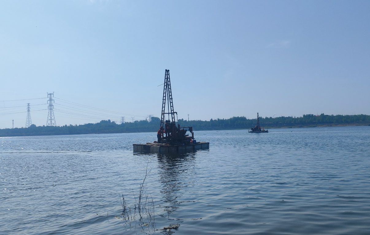 场区位于沂沭断裂带影响范围内,地质构造复杂,灰岩溶洞、溶沟、溶槽较发育,存在渗漏等风险。我公司充分发挥勘察技术优势,采用地质测绘、钻探、物探、水文试验等手段,同时使用自主研制的模块式水上钻探平台进行水上作业,该平台具有可自由拼装拆卸,浮力大、平稳安全等优点。基本查明了场区的工程地质及水文地质条件,为项目实施奠定了坚实基础。