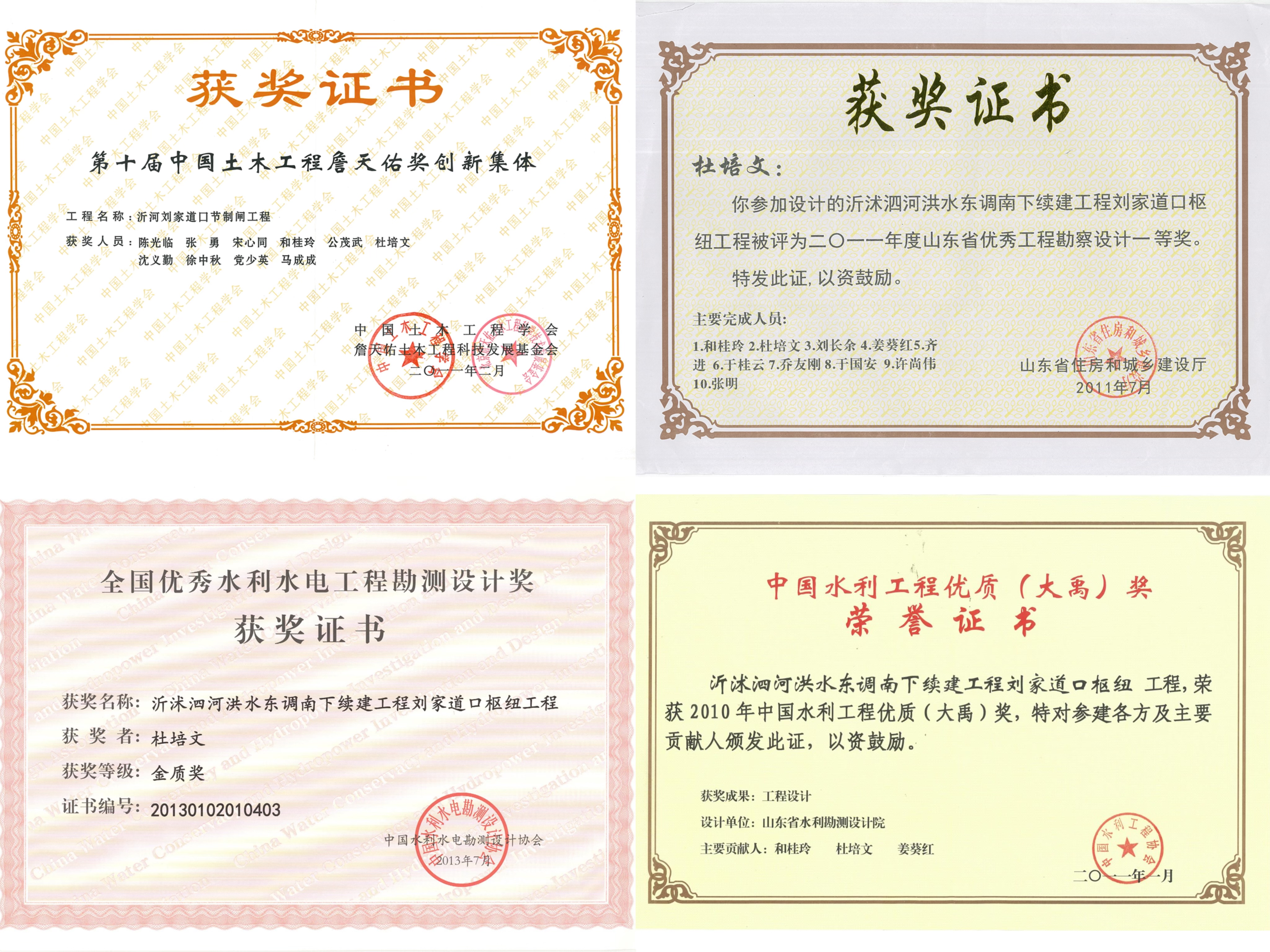 工程项目成果强地震区大型水闸金属结构关键技术研究与实践,获得2009年山东省科技进步三等奖。刘家道口枢纽工程荣获2011年度山东省优秀工程勘察设计一等奖;2010年中国水利工程优质(大禹)奖;2013年全国优秀水利水电工程勘测设计金质奖。刘家道口节制闸荣获第十届中国土木工程詹天佑奖。