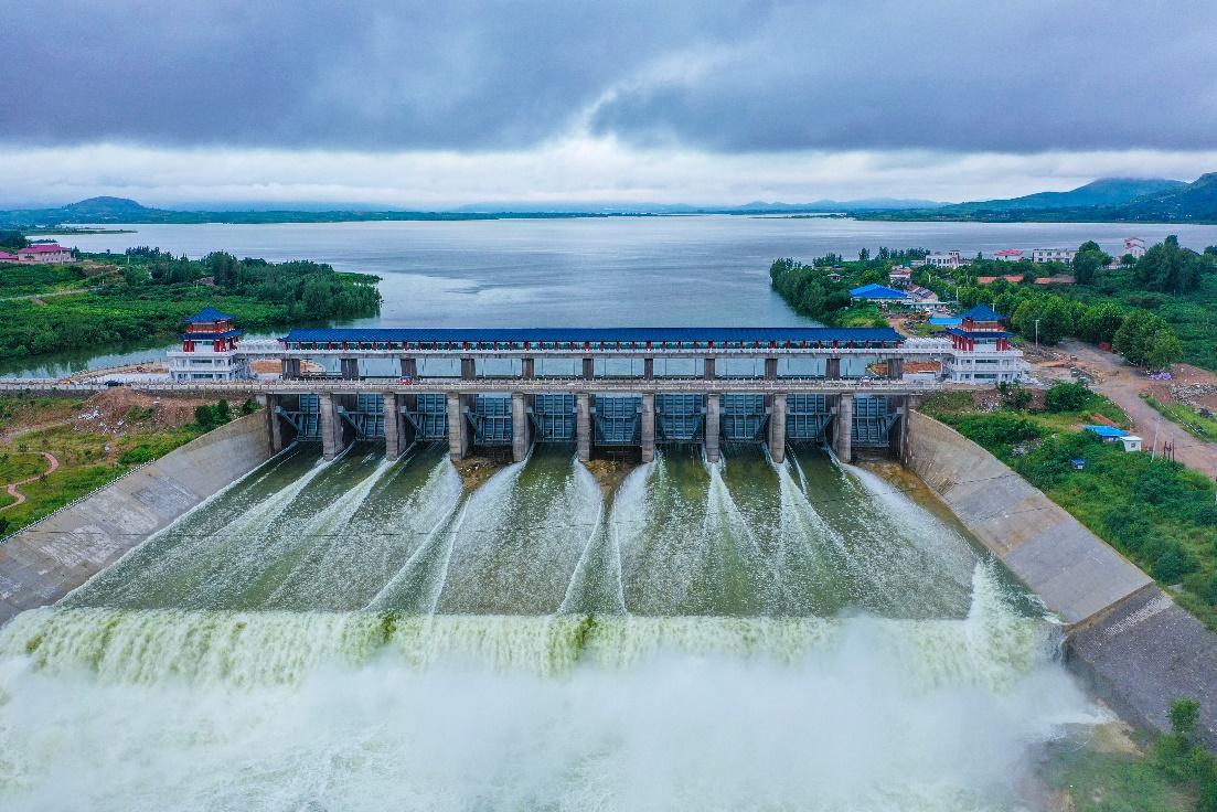 溢洪闸分左右两处共15孔。右侧溢洪闸建于1966年,共5孔,每孔设10×9.3m弧形钢闸门,启闭机采用2×200kN固定卷扬式启闭机;左侧溢洪闸建于1983年,共10孔,每孔设14×12.2m弧形钢闸门,启闭机采用2×500kN固定卷扬式启闭机;2018年除险加固方案右侧溢洪闸改建为驼峰堰、左侧溢洪闸重建,每孔设13×12m弧形钢闸门,启闭机采用2×630kN固定卷扬式启闭机;除险加固后的岸堤水库就赶上了2019年“利奇马”台风及多次超强降雨大考,充分发挥了水库枢纽防洪“利器”在蓄洪、削峰、错峰上的作用,为减轻下游沂河防洪压力、避免启用邳苍分洪道发挥了极为重要的作用。
