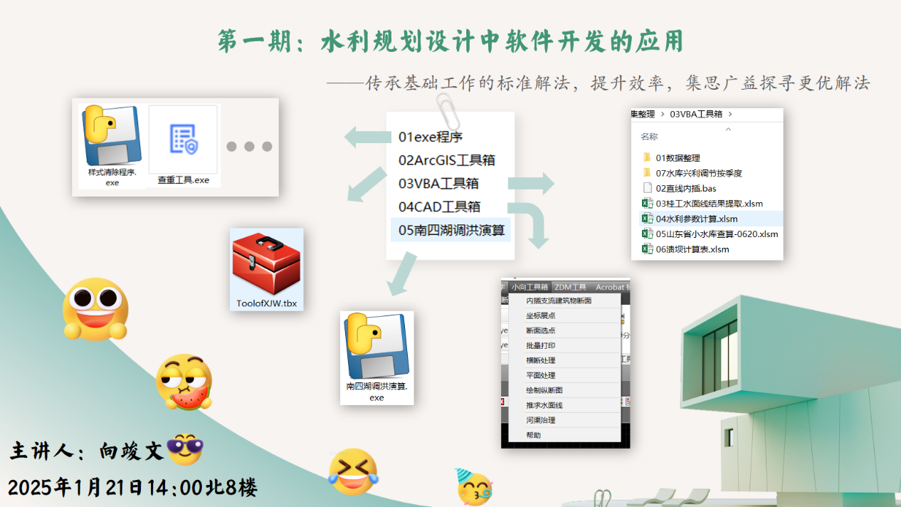 此次交流会内容分为两个部分:一是《时代浪潮中的设计院——青年设计师的使命与展望》,提出2035年基本实现AI设计、2050年全面实现智慧设计的畅想。鼓励青年设计师认清水利设计行业发展趋势,抓住AI+水利风口,实现个人发展。二是《水利规划设计中软件开发的应用——高效与创新》,针对规范查重、编制报告中Word文档格式的规范统一、ArcGIS提取断面数据、优化河道治理过程中的水面线计算、横纵断面绘制等问题,分享16项自研程序;针对工程量计算、制图、编写报告等基础工作,提出了汇编标准解法的倡议,提升工作效率。