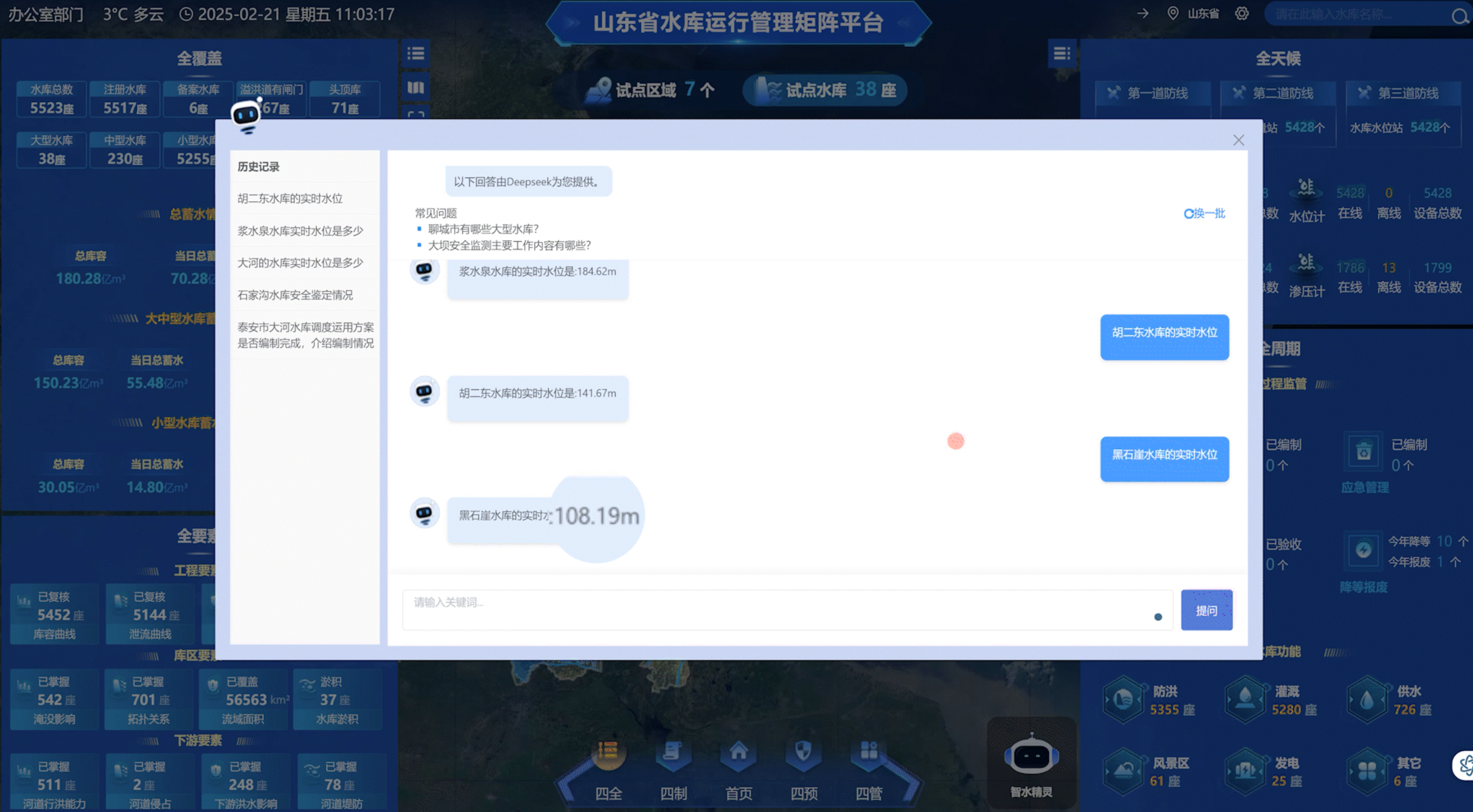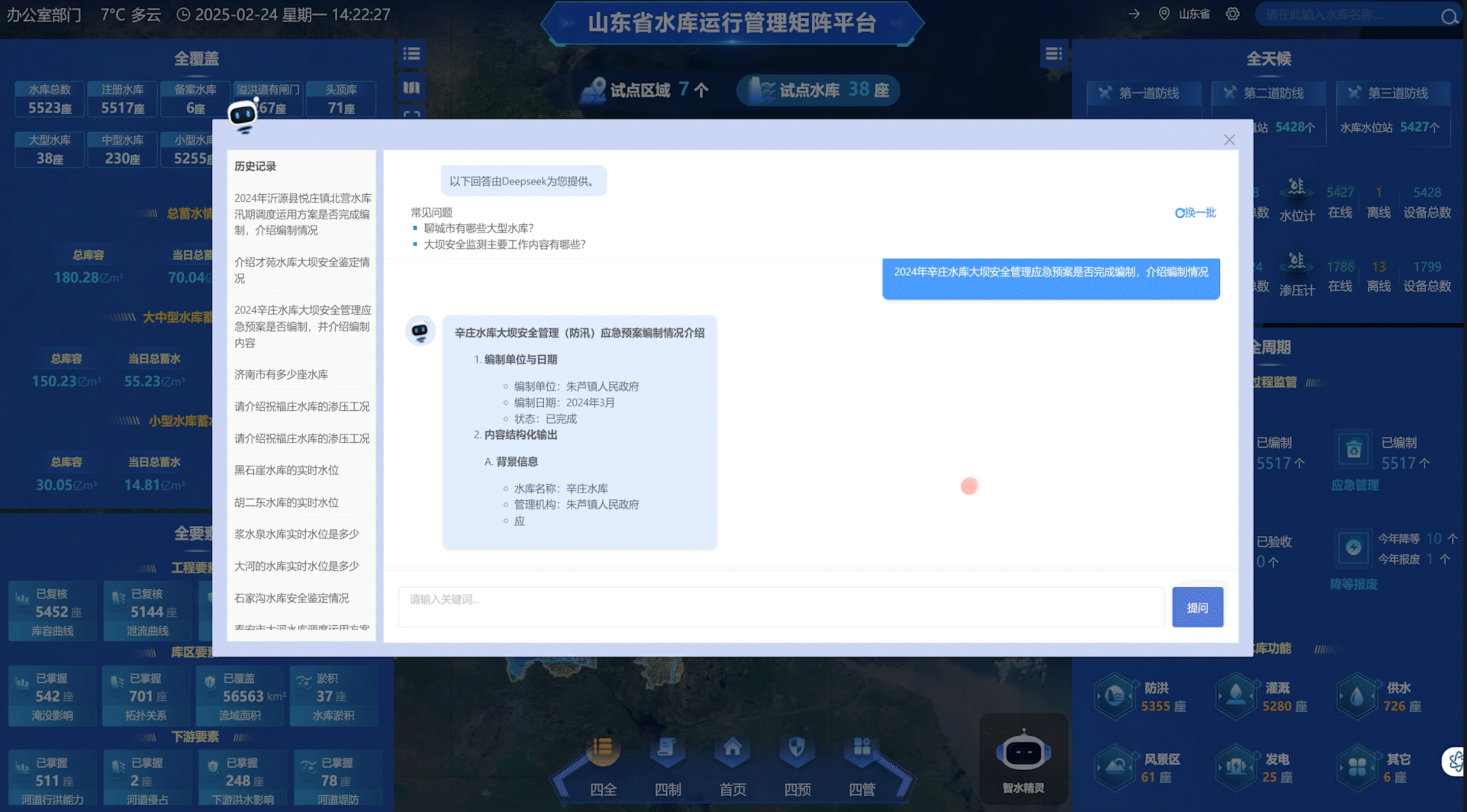 为充分挖掘水库数据价值,基于丰富的水库资料、专业文献、技术报告及标准规范,DeepSeek与水库矩阵平台携手推出了一项创新应用。该应用深度融合大模型核心技术,打造了一个功能强大的“水库全域知识中枢”,不仅实现了数据资源的深度挖掘与高效整合,更以人机对话的交互方式,大幅提升了信息检索的便捷性和问题解答的精度,有效降低了水库信息获取的难度。