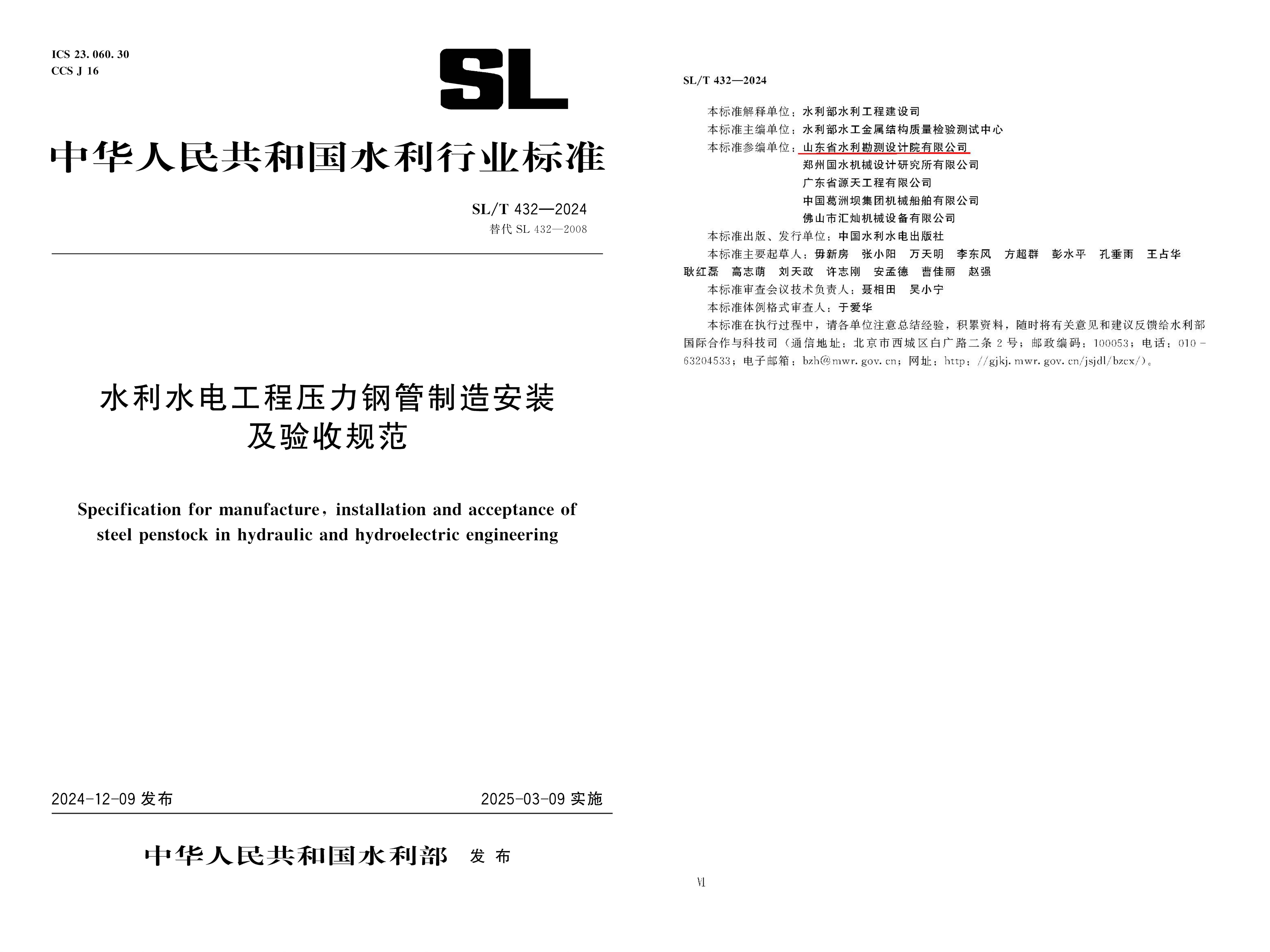 近日,由山东水设作为主要参编单位参与编制的《水利水电工程压力钢管制造安装及验收规范》(SL/T 432—2024)经水利部批准,正式面向全国发布实施。该规范是我国在压力钢管制造安装与验收领域的重要技术规范,自2008年发布以来,被水利行业设计、制造、安装、监理、检测等单位广泛采用,是水利工程压力钢管制造、安装及验收的重要依据,在规范我国水利工程压力钢管制造、安装及验收工作中发挥了重要作用。但随着我国引调水工程、抽水蓄能电站和泵站工程的发展,其适用范围已不能满足现状水利水电工程建设的需要。本次修订可加强对整个水利水电行业压力钢管的质量管理,规范压力钢管行业发展,提高压力钢管的可靠性和企业技术水平,对保证水利工程压力钢管安全运行起到重要的技术支撑作用。